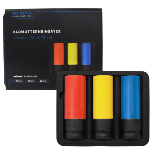 Steckschlüsseleinsatz Innenvierkant 12,5 mm (1/2") – SW 24 mm, 8 Felgenschlüssel, 2 Adapter, Schlagkörper, Zentrierdorn, Handschutz-Polster